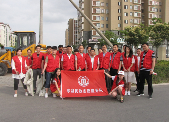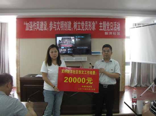 6月20日下午,亭湖区民政局机关全体党员在局党组书记张景的带领下,到新洋社区开展“创文一线党旗飘”主题党日活动。活动分为两个阶段,第一阶段区民政局机关和新洋社区共50余名党员联合组织了党课教育,区民政局党组书记张景同志以“不忘初心,方能保持本色”为主题给与会党员上了一堂生动的党课;第二阶段,区民政局与会党员在北城馨园小区开展创文活动,清理小区垃圾、铲除“牛皮癣”。活动中,新洋社区党总支书记陈红介绍了新洋社区党建基本情况,张景书记代表区民政局向新洋社区捐赠了2万元创文工作经费。区民政局全体班子成员参加的活动。
